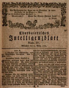 Erste Seite des Mandates “das Schulwesen, und die Schulbücher betreffend“, 5. Feb. 1771. Abb. aus: Churbaierisches Intelligenzblatt 4 (15.3.1771), 41. (Bayerische Staatsbibliothek, 4 Bavar. 3021-1771)