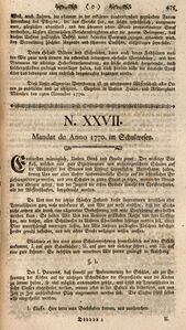 Mandat im Schulwesen von 1770. Abb aus: Sammlung der neuest und merkwürdigsten Churbaierischen Generalien und Landesverordnungen, München 1771, 475. (Bayerische Staatsbibliothek, 2 Bibl.Mont. 4499)