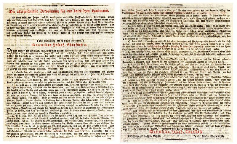 Generalmandat die Besuchung der Schulen betreffend, 23.12.1802. Abdruck in: Bayerischer neuer Volkskalender für den Bürger und Bauersmann 1803, 14 u. 15. (Bayerische Staatsbibliothek, Bibl.Mont. 1399-1803/08)