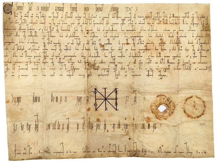 Ältestes schriftliches Zeugnis einer Alpe, der Alpe Bärgunt (Z. 8, "gemeinengunbet"), gelegen im Grenzgebiet zu Deutschland im heutigen Vorarlberg. Es handelt sich um eine Urkunde König Heinrichs IV. (1050-1106; König von 1056-1105, Kaiser von 1084-1105), mit der er dem Bischof von Augsburg den Wildbann über gewisse Wald- und Forstgebiete überträgt. Urkunde vom 5. Februar 1059, ausgestellt in Mainz. (Staatsarchiv Augsburg, Urk. 1059 II 5)