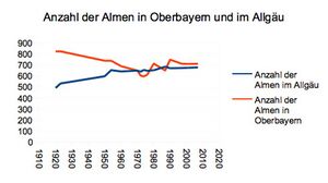 Genaue Daten über die Zahl der Almen sind erst ab den 1950er Jahren vorhanden, davor beruhen diese häufig auf Einzelzählungen oder Schätzungen. 1953 gab es in Oberbayern 716 Almen mit 26.248 ha Licht- und 92.117 ha Waldweideflächen. In Schwaben existierten zur gleichen Zeit 653 Almen mit 47.207 ha Licht- und 8.149 ha Waldweide. 1972, der Zeit der Almdepression reduzierte sich die Anzahl der bayerischen Almen auf 1240, um dann wieder anzusteigen; im 21. Jahrhundert liegt die Zahl der Almen fast konstant bei 1388 Stück.