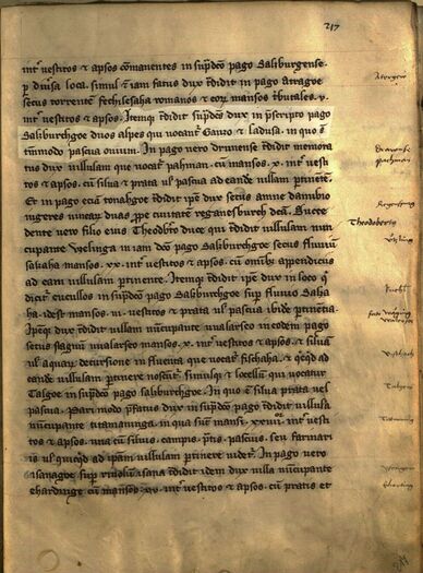 Ausschnitt einer späteren Kopie der Notitia Arnonis (8. Jahrhundert) mit der Übertragung von zwei Almen an die Salzburger Kirche (Text hervorgehoben) aus den Salzburger Kammerbüchern (Band 1), 13. bis 14. Jahrhundert. (Österreichisches Staatsarchiv, AT-OeStA/HHStA HS W 194/1, fol. 217r)