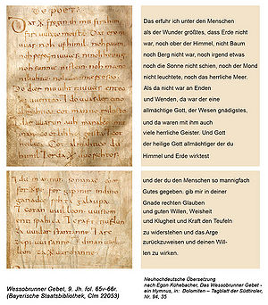 Ebenfalls mit den Erlassen Karls ("Admonitio generalis") in Zusammenhang steht die lateinisch-bairische, kolumnenmäßig angeordnete "Exhortatio ad plebem christianum", die u. a. katechetische Pflichten des Taufpaten einschärft. Das nach seinem letzten Aufbewahrungsort vor der Säkularisation benannte "Wessobrunner Gebet", eigentlich wohl aus Regensburg stammend (weniger aus der Diözese Augsburg), wäre dementsprechend als ebenso glaubensfester wie glaubensfroher Schöpfungspreis zu lesen. Überhaupt sind die aufgeführten althochdeutschen Texte nicht dem Kontext der Missionierung entsprungen. Vielmehr soll der für das 9. Jahrhundert im ganzen Herzogtum bereits bestens etablierte christliche Glaube bei den Lateinunkundigen oder Laien durch die muttersprachliche Vertiefung intensiviert werden. Diesen Laien wurde nach der Schöpfung auch das christlich gedeutete Weltende im "Muspilli" dichterisch nahegebracht. Adressat war vermutlich der Hof des jungen Karolingers Ludwigs des Deutschen, dem 817 Baiern als Teilreich zugewiesen worden war.