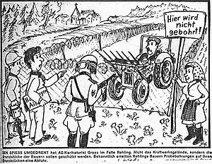 Karikatur aus der Aichacher Zeitung, 11.3.1977: "Hier wird nicht gebohrt!" (zum AKW Rehling). (Copyright: Aichacher Zeitung, Verlag Mayer & Söhne Druck- und Mediengruppe GmbH & Co. KG)