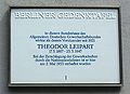 Die Gedenktafel für Theodor Leipart, Vorsitzender des ADGB von 1921 bis 1933, am ehemaligen ADGB-Haus an der Inselstraße 6 in Berlin (Fotografie: Holger Hübner).