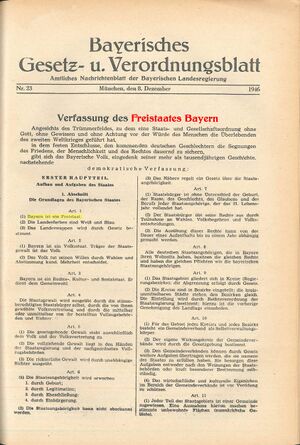 In der Bayerischen Verfassung von 1946 wird im § 1 Abs. 1 Bayern als Freistaat bezeichnet (farblich hervorgehoben). (Veröffentlichung der Bayerischen Verfassung von 1946 im Bayerischen Gesetz- und Verordnungsblatt, Nr. 23 (8.12.1946), 333)