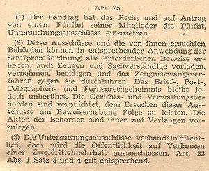 Entsprechend ihrer großen Bedeutung sind die Untersuchungsausschüsse verfassungsrechtlich abgesichert. Artikel 25 der Bayerischen Verfassung bestimmt, dass der Landtag das Recht und auf Antrag von einem Fünftel seiner Mitglieder die Pflicht hat, Untersuchungsausschüsse einzusetzen. Seit der Verfassungsänderung vom 20. Februar 1998, die die Rechte der Opposition stärkte, wechselt bei jedem neuen Untersuchungsausschuss das Recht auf den Vorsitz entsprechend der Stärke der Fraktionen; bis dahin stellte nur die Mehrheitsfraktion den Ausschussvorsitzenden. Zudem definiert Artikel 25 die Kompetenzen des Untersuchungsausschusses und stellt sicher, dass die Minderheit nicht übergangen werden kann. So verlangt er, dass die oben genannten Instrumente auf Antrag von mindestens einem Fünftel der Ausschussmitglieder angewandt werden müssen. Kontroversen über die Zulässigkeit solcher Anträge werden vom Plenum entschieden, gegen dessen Beschluss wiederum der Bayerische Verfassungsgerichtshof angerufen werden kann (Art. 25 Abs. 4 BV). Die Anwendung dieser verfassungsrechtlichen Bestimmungen regelt das Gesetz über die Untersuchungsausschüsse des Bayerischen Landtags. Im Übrigen gelten für diese die allgemeinen Bestimmungen über die ständigen Ausschüsse.