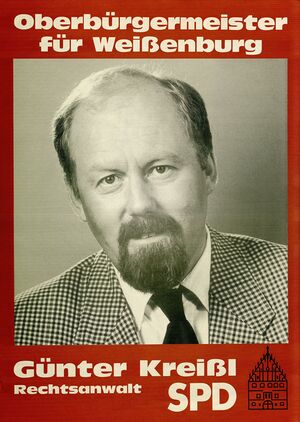 Plakat des SPD-Kandidaten Günter Kreißl (1953-2021) für die Wahl zum Oberbürgermeister in Weißenburg 1996. (StadtA Wbg, PS XII.6.1; SPD)