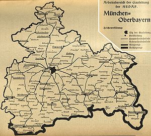 Der Gau München-Oberbayern der NSDAP wurde auf Anordnung des Parteiführers Adolf Hitler (1889-1945) mit Wirkung vom 15. November 1930 geschaffen. Er ging hervor aus der Zusammenlegung des 1929 aus der Ortsgruppe und dem Bezirksamtsbereich München gebildeten Gauverbandes Groß-München mit dem 1928 ins Leben gerufenen Gau Oberbayern. An seine Spitze trat Adolf Wagner (1890-1944), der bisherige Chef des Gauverbandes Groß-München.