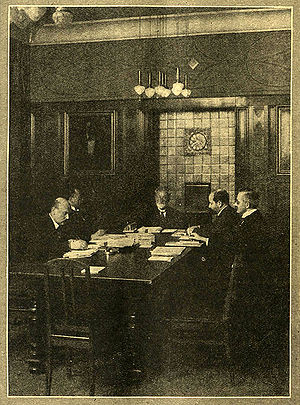 Vorstandssitzung mit den Delegierten der Gesellschafter. (aus: Fünfundsiebzig Jahre Münchner Neueste Nachrichten 1848-1922, München 1922, S. 5; Bayerische Staatsbibliothek 2 Eph. pol. 62)