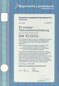 5-prozentige Inhaber-Teilschuldverschreibung über 10.000 DM der Tochtergesellschaft Bayerische Landesbank International S.A. Luxembourg, 1988. (Bayerisches Wirtschaftsarchiv, S39)