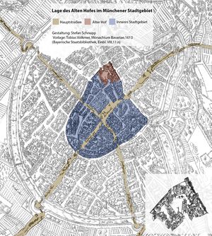Lage des Alten Hofes im Münchener Stadtgebiet.(Gestaltung: Stefan Schnupp; Vorlage: Tobias Volkmer, Monachium Bavariae,1613 (Bayerische Staatsbibliothek, Einbl. VIII,11 n))