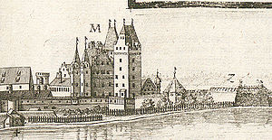 Neues Schloss Ingolstadt. Ausschnitt aus einem Kupferstich von Michael Wening (1645-1718). Abb. aus: Michael Wening, Historico-Topographica Descriptio. Das ist: Beschreibung, deß Churfürsten- und Hertzogthums Ober- und Nidern Bayrn, Bd. 1, Das Renntambt München, München 1701. (Bayerische Staatsbibliothek, Hbks/F 18-2)
