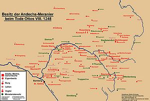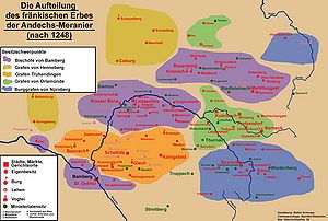 Mit dem Tod des Herzogs Otto II. erlosch am 19. Juni 1248 das Haus der Herzöge von Andechs-Meranien. Damit stand ein aus Besitzkomplexen in Krain und Istrien (heute Slowenien bzw. Kroatien), in Tirol, in Burgund (Franche-Comté) und in Oberfranken bestehendes Erbe zur Disposition. Nächste Anwärter waren die Schwestern des letzten Herzogs, deren Ehemänner und Söhne. Die Besitzungen in Krain und Istrien waren als Heiratsgut in Händen der Schwester Agnes (gest. ca. 1260/63) bzw. ihrer Ehemänner; die in Tirol fielen an den Grafen Albert III. von Tirol (gest. 1253), Schwiegervater des letzten Herzogs, die Pfalzgrafschaft Burgund an die Schwester Adelheid (gest. 1279) und deren Ehemann, Graf Hugo von Chalon (gest. 1266). Dies erfolgte offenbar stets friedlich, auch wenn Ansprüche von Miterben zum Teil erst nach längerer Zeit vertraglich abgefunden wurden. Der Besitz in Ober- und Niederbayern war 1248 schon so gut wie vollständig an die Wittelsbacher verloren gegangen.