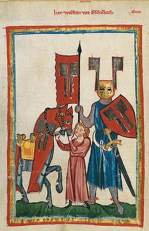Ebenfalls dem Klassischen Minnesang zugeordnet wird der bedeutende Epiker Wolfram von Eschenbach (Schaffenszeit etwa 1200-1220). Wenngleich er sich selbst in seinem "Parzival" einen Bayern nennt (wir Beiern, Pz. 121,7), gilt seine Herkunft aus dem fränkischen Eschenbach (seit 1917 Wolframs-Eschenbach) als gesichert. Auch sein erster Gönnerkreis stammte vermutlich aus Franken (Graf Poppo von Wertheim [gest. 1279], die Freiherrn von Dürn), bevor Wolfram an den großen Höfen bekannt wurde (z. B. am Hof des Landgrafen Hermann von Thüringen [reg. 1190-1217]). Von Wolfram sind neun Lieder überliefert; fünf davon sind Tagelieder, in denen er das Motiv des Wächters, der die Liebenden nach gemeinsam verbrachter Nacht zur Trennung mahnt, in die deutsche Literatur einführt.