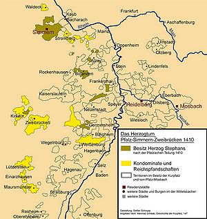 Für die weitere territoriale Entwicklung wurde aber entscheidend, dass Pfalzgraf Stephan 1409 die Erbtochter des Grafen Friedrich III. von Veldenz (gest. 1444) geheiratet hatte und über Veldenz auch noch Erbansprüche auf die Vordere und Hintere Grafschaft Sponheim geltend machen konnte. Der Erbfall von Veldenz trat 1444 ein. Der Erbvertrag vom 16. September 1444 zwischen Stephan und seinem Schwiegervater ließ zwei neue Linien, Pfalz-Simmern und Pfalz-Zweibrücken, entstehen. Bei Stephans Tod 1459 wurde der Besitz demzufolge unter seine weltlich gebliebenen Söhne geteilt: Der älteste Sohn Friedrich (reg. 1459-1480) erhielt Simmern und Sponheim und setzte die Linie Pfalz-Simmern fort, die später von 1559 bis 1685 in der Kurpfalz regierte. Dem jüngeren Sohn Ludwig (reg. 1459-1489) wurden die Grafschaften Zweibrücken und Veldenz zugesprochen. Die von ihm begründete Linie Pfalz-Zweibrücken, von der sich weitere Nebenlinien abzweigten, blieb bis zum Ende des Alten Reiches eigenständig und beerbte ihrerseits - in der zunächst wenig bedeutsamen Nebenlinie Birkenfeld-Bischweiler - die pfälzische Kurlinie.