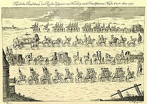 Der Rat der Stadt Nürnberg hatte die Kleinodien jeweils in die Stadt zu bringen, in der die Krönung des Königs stattfand. Das war zunächst Aachen, dessen Recht als Krönungsort bis 1806 formal fortbestand, dann meistens, aber nicht ausschließlich Frankfurt am Main, der Ort der Königswahl. Jeweils zwei bis vier Begleiter wurden vom Rat der Stadt ausgewählt; ihnen erteilte am Schluss der Krönungsfeierlichkeiten der neu Gekrönte den Ritterschlag.
