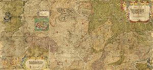 "...die Mappa uber das Ampt Rhieneck...": Der Ausschnitt aus der Spessartkarte von Elias Hoffmann aus dem Jahre 1584 zeigt das Gebiet der vormaligen Grafschaft Rieneck, die nach 1559 die mainzischen Ämter Lohr und Rieneck bildeten. (Hessisches Staatsarchiv Marburg A 11)