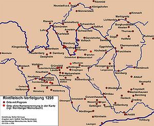 Die Judenpogrome unter Anführung des "Königs Rintfleisch" ereigneten sich um 1298 in Franken und angrenzenden Gebieten. Sie betrafen insgesamt zwischen 130 und 146 Ortschaften und forderten mindestens 4.000 bis 5.000 Opfer. Nach den Verfolgungen des Ersten Kreuzzuges um 1097 zeigte erstmals wieder die von einer Ritualmordbeschuldigung hervorgerufene Pogromwelle des "guten Werner" um 1287, die im Mosel-Mittelrheingebiet rund 20 Ortschaften erfasste und ca. 500 Opfer forderte, Tendenzen zu flächendeckenden Massakern. Die "Rintfleisch"-Verfolgung erreichte eine neue Dimension, die in den Verfolgungen der ersten Hälfte des 14. Jahrhunderts ("Armleder" 1336/38; Brunnenvergiftungsbeschuldigung 1348/50) noch übertroffen werden sollte.
