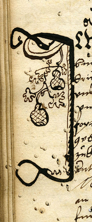 Initiale "I" mit der bislang ältesten bekannten Abbildung eines Bocksbeutels in einem Kopiar des Bürgerspitals von 1551 oder unmittelbar später. (StadtAW BSP/8, fol. 75v, Foto: Ingrid Rack)