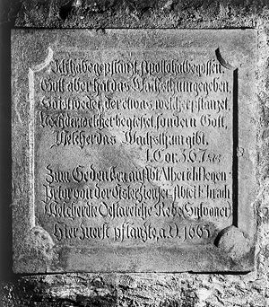 Gedenktafel für die erste Silvanerpflanzung in Würzburg durch Abt Alberich Degen 1665. (Bürgerspital Weingut Würzburg)