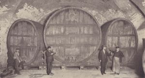 Die großen Beamtenweinfässer im Staatlichen Hofkeller Würzburg. Abb. aus: Das Bayerland, Jahrgang 35 vom Oktober 1924, 349. (Bayerische Staatsbibliothek, 4 Z 40.173-35)