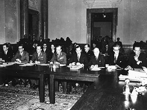 Sitzung des Alliierten Kontrollrats in Berlin im Februar 1948. Der Alliierte Kontrollrat trat erstmals am 30. Juli 1945 während der Konferenz von Potsdam zusammen. Im Kontrollrat sollten die vier Militärgouverneure gemeinsam Entscheidungen für Belange treffen, die alle Besatzungszonen berührten. (Bayerische Staatsbibliothek, Fotoarchiv Hoffmann, hoff-61442)