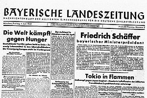 Titelblatt der Bayerischen Landeszeitung vom 1. Juni 1945. Der ehemalige Vorsitzende der Bayerischen Volkspartei (BVP), Fritz Schäffer (CSU, 1888-1967, Ministerpräsident 1945), wurde am 28. Mai 1945 von der amerikanischen Militärregierung zum "Temporary Minister-Präsident for Bavaria" ernannt. Bereits wenige Monate später wurde er von der Militärregierung am 28. September 1945 seines Amtes enthoben. (Bayerische Staatsbibliothek, Fotoarchiv Hoffmann, hoff-64500)