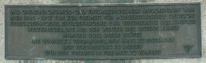 Das Lager Moschendorf wurde 1957 aufgelöst und die Baracken 1962 abgerissen. Seit 1980 erinnert ein von Fritz Theilmann (1902-1991) geschaffenes Denkmal an das Lager. ([Foto von PeterBraun74 lizensiert durch CC BY-SA 3.0 via Wikimedia Commons)