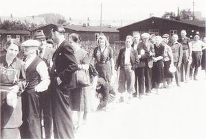 In einer zentralen Lagerküche wurde das Essen für die Lagerbewohner gekocht. Bei der Essensausgabe bildeten sich oft lange Schlangen. (Sudetendeutsches Archiv, Bildersammlung 21404, mit Genehmigung des Stadtarchives Furth im Wald)
