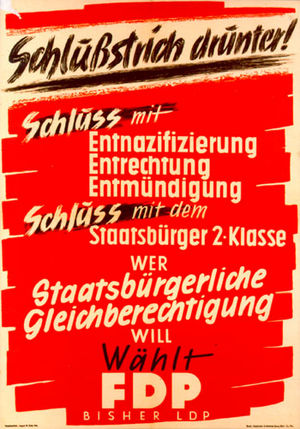 1949 forderte die FDP bei der Bundestagswahl, unter die NS-Geschichte einen Schlussstrich zu ziehen. Das zugehörige Wahlplakat bediente sich hierfür orthographisch dem Doppel-S, wie es die sog. Schutzstaffeln (SS) und ihre Unterorganisationen nutzten. (Bild: Haus der Geschichte, Bonn)