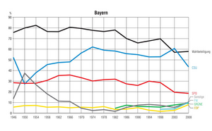 Wahlbeteiligung und Gesamtstimmen seit 1946. (Quelle: Bayerisches Landesamt für Statistik und Datenverarbeitung, München 2009)