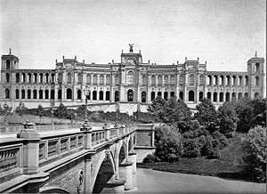 Das 1874 fertiggestellte Maximilianeum ist nach der Zerstörung des einstigen Landtagsgebäudes in der Münchner Innenstadt seit 1949 auch Sitz des bayerischen Landtags. Aufnahme von Friedrich Bruckmann um 1900. (Bayerische Staatsbibliothek, Porträt- und Ansichtensammlung, port-003240)