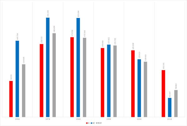 Verkaufsauflagen von tz, AZ (Süd bzw. München) und BILD-München 1968-2018, jeweils IV. Quartal. (Quelle: Informationsgemeinschaft zur Feststellung der Verbreitung von Werbeträgern e.V.)