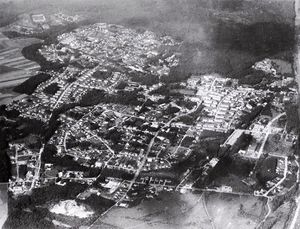 Luftaufnahme von Waldkraiburg aus dem Jahr 1960. Im Vordergrund ist die sog. Moll-Kiesgrube (Westpark) zu sehen. (Stadtarchiv Waldkraiburg)