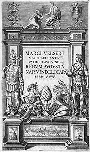 Titelblatt der Augsburger Frühgeschichte (Rerum Augustanarum Vindelicarum libri VIII., Venedig 1594) des Markus Welser (1558-1614). (Staatliche Bibliothek Regensburg, 999/Bav.883)