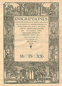 Titelblatt der Quellensammlung von Konrad Peutinger (1465-1547). Abb. aus: Konrad Peutinger, Inscriptiones Vetvstae Roman. Et Earvm Fragmenta In Avgvsta Vindelicorum Et Eivs Diocesi, [Mainz] 1520. (Bayerische Staatsbibliothek, Res/2 Arch. 75#Beibd.1)