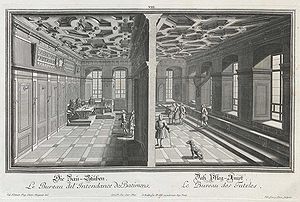 Baustube und Pflegamt im Augsburger Rathaus. Abb. aus: Salomon Kleiner, Das Prächtige Rath Hauß der Stadt Augspurg, Augsburg 1733, Taf. VIII. (Bayerische Staatsbibliothek, Res/2 Bavar. 476 r)