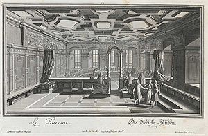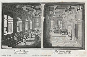 Vorzimmer und Steuerstube im Augsburger Rathaus. Abb. aus: Salomon Kleiner, Das Prächtige Rath Hauß der Stadt Augspurg, Augsburg 1733, Taf. XI. (Bayerische Staatsbibliothek, Res/2 Bavar. 476 r)