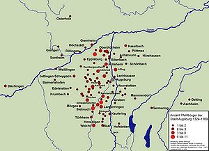 Rolf Kießling (geb. 1941) hat in mehreren Studien das Wechselverhältnis von Stadt und Umland herausgearbeitet, das im Falle einer Wirtschaftsmetropole wie Augsburg besonders ausgeprägt war. Hierbei kam den nahen Orten Lechhausen, Meringerau und Hochzoll (zu Bayern) sowie Kriegshaber, Oberhausen, Pfersee (alle Markgrafschaft Burgau, heute alle Stadt Augsburg) eine besondere Rolle zu. Insgesamt zeigen sich reichsstädtische Möglichkeiten, über die Stadtmauer auszugreifen und Einfluss auf die umgebende Region zu nehmen, doch gelang der Ausbau eines größeren Territoriums bis zum Ende des Alten Reiches nicht. Allerdings konnten einige der in Augsburg ansässigen Stifte wie die Augustinerchorherren von St. Georg und Heilig Kreuz oder die adligen Damen von St. Stephan beträchtlichen Grundbesitz und Rechte im näheren und ferneren Umland erwerben. Hinzu kamen Bürger, die sich Grundbesitz kauften und zum Teil auch den Weg in Richtung Landadel nahmen. Berühmtestes Beispiel sind die Fugger, die sich eine stattliche Herrschaft in Mittelschwaben aufbauen konnten. Die Erwerbungen – mit Höhepunkt im 16. Jahrhundert – setzten sich bis zum Ende des Alten Reichs fort. Im näheren Umkreis Augsburgs waren die Langenmantel in Westheim oder die Stetten in Hammel und Aystetten begütert. Da sich Besitz- und politische Elite zuweilen deckten, waren Einflussnahmen auf das Umland auch auf diesem Wege möglich, wenngleich sich die familiären Interessen und solche des Gemeinwesens überlagerten.