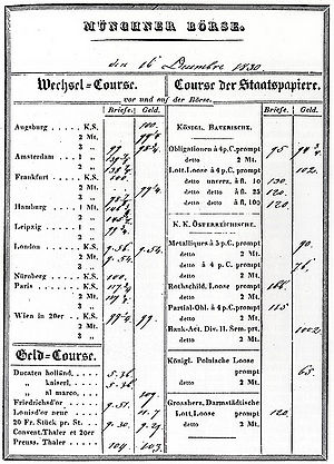 1830 nahm die Börse in München unter Leitung der Münchner Kaufmannsstube den Betrieb auf, doch blieb die ältere Augsburger Börse zunächst weiterhin tonangebend in Bayern. Erst die Einführung der Gewerbefreiheit in Bayern 1868, die Übernahme der Börsen-Trägerschaft durch den Münchner Handelsverein 1869 und die Entwicklung Münchens zum führenden bayerischen Bankenplatz seit den 1860er Jahren bewirkten einen deutlichen Aufschwung. Die Münchner Börse wurde nun zur maßgebenden Plattform für den Wertpapierhandel in Bayern und zählte zu Beginn des 20. Jahrhunderts zu den fünf wichtigsten Börsen im Deutschen Reich. In der Zwischenkriegszeit blieb sie die Leitbörse für bayerische Werte. Unter der NS-Herrschaft erfolgte 1935 die Zwangsfusion der Münchner und der Augsburger Börse zur "Bayerischen Börse", der Wertpapierhandel wurde in der Folgezeit stark reglementiert. Nach 1945 profitierte die Börse München vor allem vom Bedeutungsverlust der Berliner Börse. Sie zählte weiterhin zu den vier wichtigsten Regionalbörsen in der Bundesrepublik, deren Bedeutung jedoch gegenüber der den deutschen Börsenmarkt absolut beherrschenden Deutschen Börse in Frankfurt stark abnahm.