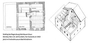 - vor 1410 d Matting an der Donau, Wolfgangstraße 9, jetzt Freilandmuseum Bad Windsheim, Steinbau/Bohlenstube