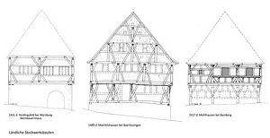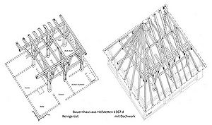 - 1367 d Höfstetten, jetzt Freilandmuseum Bad Windsheim, zweireihiges hohes Innengerüst, Vollwalm, Stube