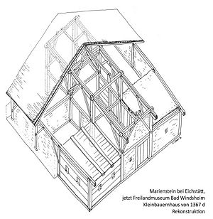 - 1367 d Marienstein (Lkr. Eichstätt), jetzt Freilandmuseum Bad Windsheim, zweireihiges Innengrüst, Kalkplattendach