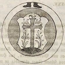 Siegel eines vor Bildhausen gelegenen Bauernhaufens: auf einem Hügel aufgerichtetes Kreuz umgeben von Pflanzen. Abbildung aus: Lorenz Fries, Siegel der fränkischen Bauern: Geschichte, Namen, Geschlecht, Leben, Thaten und Absterben der Bischöfe von Würzburg und Herzoge von Franken, auch was während der Regierung jedes Einzelnen derselben Merkwürdiges sich ereignet hat. 2/2, Würzburg 1849, 33. (Bamberg, Staatsbibliothek, HV.H.Franc.16(2)