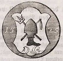 Siegel der Rothenburger Landwehr: Dreizack und Dreschflegel überkreuzt, darüber aufliegend eine Pflugschar, die in einen Stiefel mündet. Abbildung aus: Lorenz Fries, Siegel der fränkischen Bauern: Geschichte, Namen, Geschlecht, Leben, Thaten und Absterben der Bischöfe von Würzburg und Herzoge von Franken, auch was während der Regierung jedes Einzelnen derselben Merkwürdiges sich ereignet hat. 2/2, Würzburg 1849, 32. (Bamberg, Staatsbibliothek, HV.H.Franc.16(2)