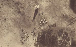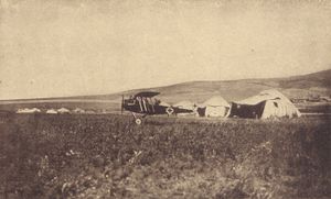 Englisches Truppenlager in der Oase El Katia. Neben dem Lager explodiert eine deutsche Fliegerbombe. (Abb. aus: Zeidelhack, Bayerische Flieger, 69)