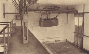 Artillerieeinschießraum mit den Lehrapparaten für Bombenabwurf: Rollende Karte, darüber die Übungsmaschine mit Führer und Beobachter. (Abb. aus: Zeidelhack, Bayerische Flieger, 160)