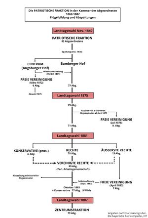 Flügelbildung und Abspaltungen der Patriotischen Fraktion in der Kammer der Abgeordneten im Bayerischen Landtag (1869-1887). (Angaben nach: Hartmannsgruber, Die bayerische Patriotenpartei, 311)