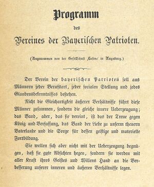 Verein der Bayerischen Patrioten, München 1868. Auszug aus dem Programm, übernommen in Augsburg. (Staatsarchiv München, RA 28876)